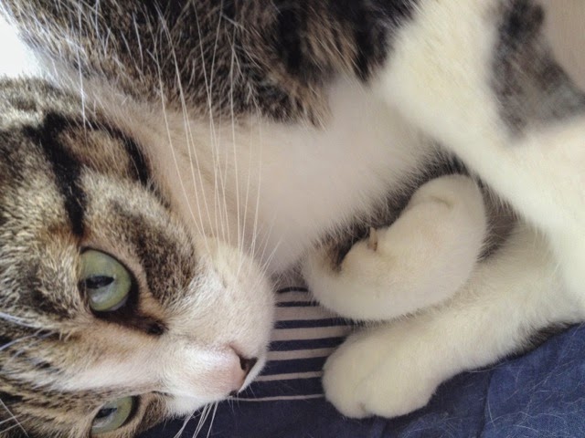 我和Lightning貓先生嘀嘀咕咕,摟摟抱抱,相親相愛的時候,不時會看見MoonMoon貓小姐在房門外跑來跑去,對我們不屑一顧的樣子。有時候她也會跑進房間,跳上書桌,背對我們,